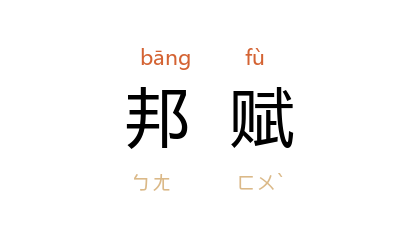 ⒈ 《周礼·天官·职内》:“掌邦之赋入。”贾公彦疏:“掌邦之赋入者,谓九职、九贡、九赋之税入皆掌之,独云赋入者,赋是揔名。”后因以“邦赋”指国家财政。