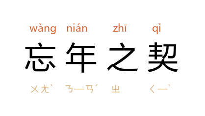 ⒈ 不拘年岁行辈而结交为友。唐·颜真卿〈孙逖文集序〉:「十五时,相国齐公崔日用试土火?赋,公雅思遒丽,援翰立成,齐公骇之,约以忘年之契。」也作「忘年之交」。