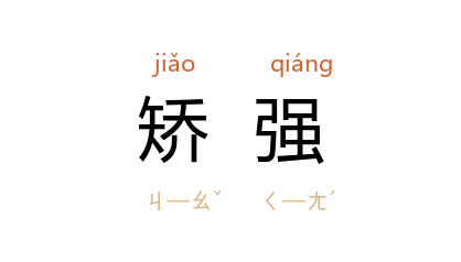 引明 王守仁 《传习录》卷下:“我前日用得功夫了,今却不济,便要矫强做出一个没破绽的模样,这便是助长,连前些日子功夫都坏了。”《平山冷燕》第四回:“夏之忠、卜其通 同説道:‘学问才情矫强不得,此时若要成篇,也还容易,只恐成篇终不及 山小姐 词意秀美,到不如见圣上认罪罢了。’”《老残游记》第十三回:“老残 道:‘好,好,好!我就陪你谈谈。我对你説罢,我回屋子也是坐着,何必矫强呢?’”