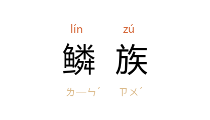 引晋 挚虞 《观鱼赋》:“观鳞族於滮池兮,睨羽羣於瀨涯。”明 冯时可 《雨航杂录》卷下:“海上鳞族异者,名章巨,大者名石拒,居石穴,人取之,能以脚粘石拒人,故名。”徐珂 《清稗类钞·动物·人鱼》:“约半小时,二人行渐近,觉脐腹以上具人形,腹以下为鳞族,同立水上,以尾泼剌而行。”