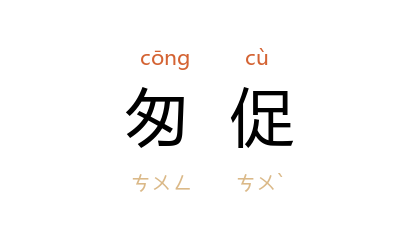 引唐 杜甫 《雨不绝》诗:“眼边江舸何匆促,未待安流逆浪归。”茅盾 《子夜》二:“刚才和 佩瑶 商量,觉得老太爷大殓的时刻还是改到后天上午好些,一则不匆促,二则 曾沧海 舅父也可以赶到了。”