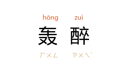 引宋 贺铸 《鹧鸪天》词:“轰醉王孙玳瑁筵,渴虹垂地吸长川。”金 元好问 《与张杜饮》诗:“轰醉春风一千日,愁城从此不能兵。”清 赵翼 《竹君述庵蕺园来殷耳山璞函小集寓斋即事》诗之二:“祇因轰醉过残腊,此便消寒第一巡。”