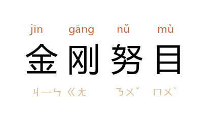 ⒈ 本指寺院护法菩萨睁目凸眼的样子。后引申为凶怒时的表情或威猛的形象。也作「金刚怒目」。