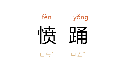 引汉 王粲 《为刘荆州与袁尚书》:“今整飭士马,愤踊鹤立,冀闻和同之声,约一举之期。”《后汉书·度尚传》:“众闻咸愤踊, 尚 勑令秣马蓐食,明旦,径赴贼屯。”《三国志·魏志·陈泰传》:“夜至 狄道 东南高山上,多举烽火,鸣鼓角。 狄道 城中将士见救者至,皆愤踊。”唐 柳宗元 《上襄阳李愬仆射献唐雅诗启》:“谨撰《平淮夷雅》二篇……庶继代洪烈,稗官里人,得採而歌之,不胜愤踊之至。”