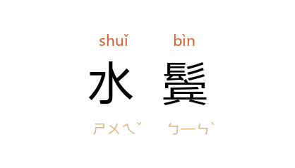 ⒈ 亦作“水髩”。古代妇女以刨花水涂搽两鬓,梳理后服贴整齐而有光泽,因称妇女之鬓角头发为“水鬢”。