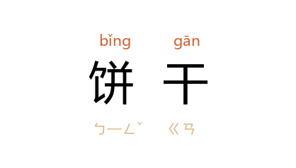 ⒈ 用面粉做成片状,再以火烘熟的食品。形状种类很多。也作「饼干」。