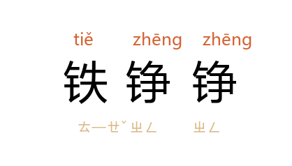 ⒈ 铮铮,金属撞击的声音。铁铮铮形容不向恶势力屈服的威武样子。