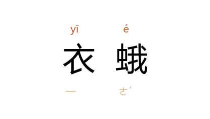 ⒈ 动物名。节肢动物门昆虫纲鳞翅目谷蛾科。幼虫除头部及第一节背部淡褐色外,余皆白色。成蛾长约六公厘,黄褐色,翅膀边缘有毛,头部密生黄褐色细毛,胸背灰色,腹褐色,前翅有光泽。因幼虫喜蛀食衣服、毛皮等,故称为「衣蛾」。
