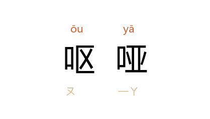 ⒈ 状声词:(1) 形容小儿学语声。唐·白居易〈念金銮子〉诗二首之一:「况念夭札时,呕哑初学语。」(2) 形容管乐声。唐·杜牧〈阿房宫赋〉:「管弦呕哑,多于市人之言语。」(3) 形容鸟鸣声。宋·欧阳修〈赠无为军李道士〉诗二首之二:「李师一弹凤皇声,空山百鸟停呕哑。」(4) 形容车轮滚动声。唐·曹邺〈四怨〉诗之四:「手推呕哑车,朝朝暮暮耕。」(5) 形容船橹声。唐·胡宿〈赵宗道归辇下〉诗:「江浦呕哑风送橹,河桥勃翠柳垂堤。」宋·陆游〈鹧鸪天·嬾向青门学种瓜〉词:「歌缥缈,?呕哑,酒如清露鲊如花。」也作「呕轧」。