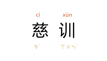 引《文选·谢朓<齐敬皇后哀策文>》:“閔予不祐,慈训早违。”李善 注引《晋中兴书》:“肃祖 太妃 荀氏 薨, 显宗 詔曰:‘朕少遭閔凶,慈训无禀。’”清 陈裴之 《湘烟小录》:“前日读君家大人慈训有曰:‘惜身心而报以笔墨,俾与 朝云、蒨桃 并传。’”