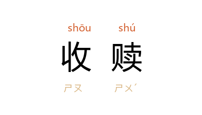 ⒈ 收购。用银钱将抵押品赎回。旧时法律凡老幼、废疾、笃疾、妇人犯徒流等刑者,准其以银赎罪,谓之收赎。