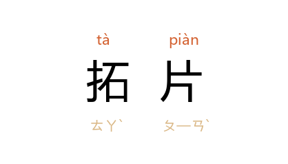 ⒈ 将碑刻、金石文物等上面的字画、图案拓印下来,成为单页的纸片,称为「拓片」。