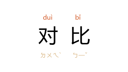 ⒈ 以两种不同的观念或事物,互相比较对照。如黑与白、大与小,而使其特征更加明显者,称为「对比」。