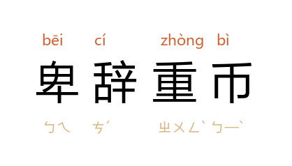 引《战国策·秦策三》:“卑辞重币以事之。”《史记·范雎蔡泽列传》:“齐 惧,必卑辞重币以事 秦。”亦作“卑辞厚币”。 《新唐书·李抱真传》:“抱真 喜士,闻世贤者,必欲与之游,虽小善,皆卑辞厚币数千里邀致之。”清 薛福成 《庸盦笔记·裕靖节公殉难》:“若木 由是名闻 江 南,凡 两江 总督到任,必卑辞厚币,敦请入幕,为上宾者数十年。”