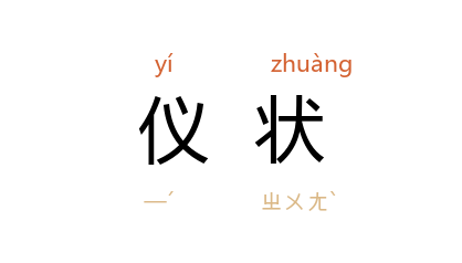 引《史记·儒林列传序》:“太常择民年十八已上,仪状端正者,补博士弟子。”《后汉书·明德马皇后纪》:“援 有三女,大者十五,次者十四,小者十三,仪状髮肤,上中以上。”宋 苏洵 《上张侍郎第一书》:“进趋拜跪,仪状甚野。”明 何良俊 《四友斋丛说·杂记》:“太初 诗格本高,又仪状轩举,丰神俊异。”