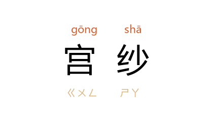 引宋 蒋捷 《小重山》词:“银红裙襇皱宫纱,风前坐,閒鬭鬱金芽。”清 孔尚任 《桃花扇·逢舟》:“这封书不是笺纹,摺宫纱夹在斑筠。”
