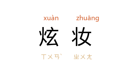 引清 蒲松龄 《聊斋志异·萧七》:“女郎亦炫妆出,姿色絶俗。”清 蒲松龄 《新郎》:“新郎出,见新妇炫装,趋转舍后。”清 袁枚 《随园诗话》卷二:“张燕公 称 阎朝隐 诗,炫装倩服,不免为风雅罪人。”
