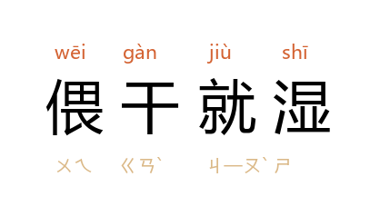 ⒈ 小孩尿床,母亲宁愿自己睡湿的地方,而让小孩睡在干的地方。比喻母亲抚育孩子的辛苦。元·无名氏也作「煨干避湿」、「煨干就湿」。