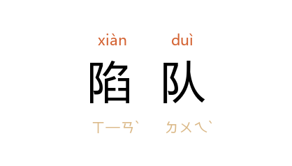 引《商君书·境内》:“陷队之士,面十八人。陷队之士知疾鬭,不得斩首队五人,则陷队之士、人赐爵一级。”高亨 注:“朱 説:‘陷队,勇敢陷阵之士,即今之敢死队。’不,当作‘而’,篆文形似而误。”