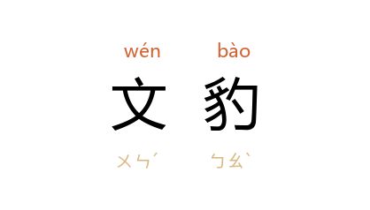 引《庄子·山木》:“夫丰狐文豹,栖於山林,伏於巖穴,静也。”南朝 梁 江淹 《石劫赋》:“比文豹而无恤,方珠蛤而自寧。”《新唐书·西域传下·康》:“开元 十五年,君 忽必多 献舞女、文豹。”宋 梅尧臣 《题姑苏豹隐堂诗》:“青山崔巍藏古基,文豹不见空断碑。”明 陈汝元 《金莲记·射策》:“千秋雾影飞文豹,三殿花香落锦袍。”
