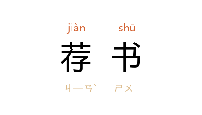 引《儒林外史·第七回》:「二位官府封了五钱银子,又写了一封荐书,荐在那新升通政司范大人家。」