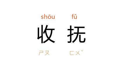引《后汉书·臧洪传》:“洪 收抚离叛,百姓復安。”清 魏源 《圣武记》卷一:“﹝ 太宗 ﹞乃命副都统 霸奇兰 率兵逾 黑龙江,收抚其未服壮丁二千四百有奇。”姚雪垠 《长夜》四十:“他既然收抚了姓 安 的,我姓 李 的他别想收抚。”