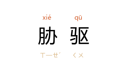 引《诗·秦风·小戎》:“游环胁驱,阴靷鋈续。”毛 传:“胁驱,慎驾具,所以止入也。”孔颖达 疏:“胁驱者以一条皮上繫於衡,后繫於軫,当服马之胁,爱慎乘驾之具也。驂马欲入,则此皮约之,所以止入也。”宋 沉括 《梦溪笔谈·器用》:“胁驱,长一丈,皮为之,前繫於衡,当驂马内,所以止入。”