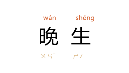 ⒉ 后辈对前辈自谦之称。 宋 代士大夫对位高年长者自称晚生; 明 清 翰林入馆,投刺于先登甲第者,书晚生。参阅 宋 邵伯温 《闻见前录》卷八、 明 王世贞 《觚不觚录》、 清 阮葵生 《茶馀客话》卷二。