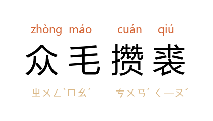⒈ 攒:聚;裘:皮衣。聚集许多小块皮毛,能够缝成一件皮衣。比喻积少成多。