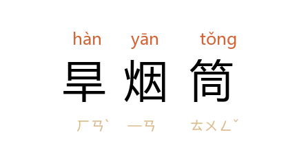引《二十年目睹之怪现状》第六八回:“﹝那妇人﹞手里拿了一根近五尺长的旱烟筒,在那里吸烟。”许地山 《枯杨生花》:“一个人吸着旱烟筒从那边走来。”