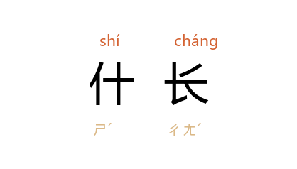 引《墨子·备城门》:“城上十人一什长,属一吏士,一帛尉。”《宋史·兵志六》:“三路见训民兵非久,什长艺成,须便行府界团教之。”《老残游记》第六回:“这闺女有一天在门口站着,踫见了府里马队上什长 花肐膊 王三。”