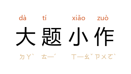 ⒈ 本是明清科举考试的惯用语。题目摘自五经中之文句,称为「大题」;题目出自四书中的文句,称为「小题」。尚应试者以作四书文的章法写五经文,称为「大题小作」。后用以比喻把重大的问题当作小事情来处理,有轻忽的意思。