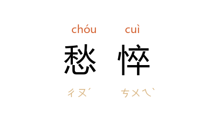 引《吕氏春秋·顺民》:“﹝ 越王 ﹞时出行路,从车载食,以视孤寡老弱之溃病;困穷颜色愁悴不赡者,必身自食之。”唐 罗隐 《寄郑补阙》诗:“别来愁悴知多少,两度槐花马上黄。”宋 柳永 《郭郎儿近拍》词:“愁瘁,枕簟微凉,睡久辗转慵起。”宋 朱熹 《九日》诗:“薄宦驱人向愁悴,旧游惟我最颠狂。”