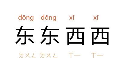引《朱子语类》卷一〇四:“譬如人治生,也须先理会箇屋子,安著身己,方始如何经营,如何积累……为学者不先存此心,虽説要去理会,东东西西,都自无安著处。”《红楼梦》第八八回:“我这里有机会,少不得打发人去叫你;没有事也没法儿,不在乎这些东东西西上的。”