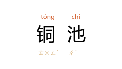 引《汉书·宣帝纪》:“金芝九茎产於 函德殿 铜池中。”颜师古 注:“铜池,承霤是也,以铜为之。”南朝 陈 徐陵 《劝进元帝表》:“芝房感德,咸出铜池。”明 冯时可 《月赋》:“金埒铜池,擷芳瞩丽。”