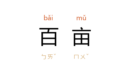 ⒈ 亦作“百畮”。一百亩土地。亦泛指广阔之地。