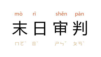 ⒈ 又称最后审判。基督教谓耶稣将于世界末日,审判古今全人类,分别善人恶人,善人升天堂,恶人下地狱。亦泛指在灭亡时受审。