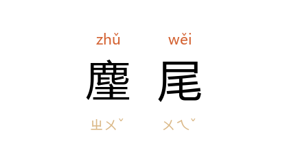 ⒈ 古人闲谈时执以驱虫、掸尘的一种工具。在细长的木条两边及上端插设兽毛,或直接让兽毛垂露外面,类似马尾松。因古代传说麈迁徙时,以前麈之尾为方向标志,故称。后古人清谈时必执麈尾,相沿成习,为名流雅器,不谈时,亦常执在手。