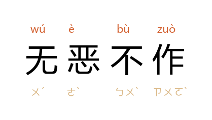 引《醒世姻缘传·第七三回》:「程大姐自到周龙皋家,倚娇作势,折毒孩子,打骂丫头,无恶不作。」《二十年目睹之怪现状·第六五回》:「他本是一个包揽词讼,无恶不作的人啊!」