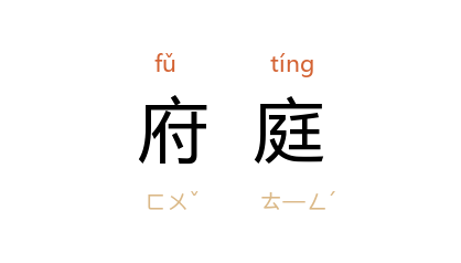 引汉 王充 《论衡·量知》:“远而近諫,《礼》谓之諂,此则郡县之府庭所以常廓无人者也。”宋 王谠 《唐语林·补遗四》:“近代通谓府庭为公衙,公衙即古之公朝也。”明 宋濂 《方愚庵墓版文》:“府庭之间,不陈杻械,革鞭悬楹间,示不妄罚。”