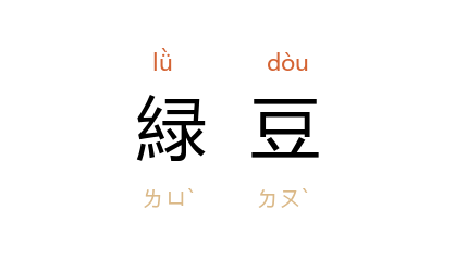 ⒈ 植物名。豆科菜豆属,一年生草本。高约三十多公分,茎瘠长,有毛。顶生叶卵状菱形,为三出复叶。总状花序,开黄色蝶形花,花谢结线形荚果。荚果内含绿色种子,可供食用,无论煮汤或磨粉制成糕饼都很可口。也作「菉豆」。