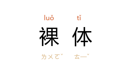 ⒈ 身体不穿衣物,赤身露体。也作「裸身」。