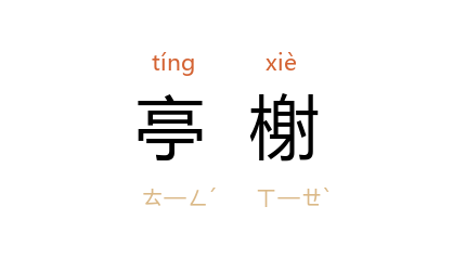 引南朝齐·谢朓〈三日侍宴曲水代人应诏〉诗九首之七:「极望天渊,曲阻亭榭。」《初刻拍案惊奇·卷九》:「那杏园中花卉之奇,亭榭之好,诸贵人家所不能仰望。」
