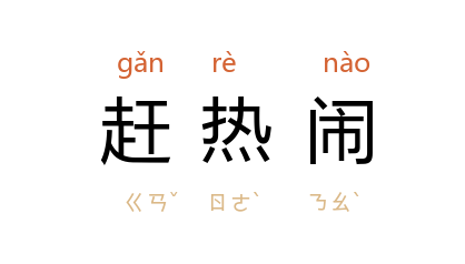 引茅盾 《动摇》十:“赶热闹的闲人,把五六亩大的空场挤得密密层层。”徐铸成 《报海旧闻》三二:“四乡的农妇村姑,穿着红布棉袄,坐船来赶热闹,庙前的河面上,停满了小船。”