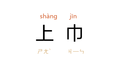 ⒈ 谓加冠。古代男子成年(二十岁)则举行加冠礼,先用一种丝织的头巾束发,然后再戴上冠。因以“上巾”指“加冠”。