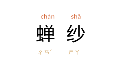 引元 杨维桢 《内人剖瓜词·为顾瑛题盛子昭画》:“美人睡起袒蝉纱,照见臂釵红肉影。”清 二石生 《十洲春语》卷下:“製椒兰为舟,蝉纱葵锦,笼头擷腰,明眸皓齿,含笑荡桨,谓之纱船。”