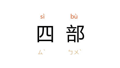 ⒈ 中国古代图书分类名称。将群书分为甲、乙、丙、丁或经、史、子、集四类,称“四部”。如:《四部备要》。详“四部书”。唐时骠国乐工编制,分为四部。