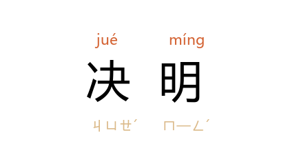 ⒈ 植物名。豆科。一年生草本。偶数羽状复叶。夏秋开花,花黄色。荚呈长角状,略有四棱。原产热带 美洲,我国各地皆有栽培。嫩苗、嫩果可食。种子称决明子,代茶或供药用,有清肝明目之功效。参阅 明 李时珍 《本草纲目·草五·决明》。