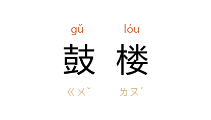 ⒈ 城隅上置放巨鼓的楼房。用以报时或警戒盗贼。佛寺亦有鼓楼,与钟楼相对,建于正殿的左右,用以悬鼓报时,或于典礼时敲击。