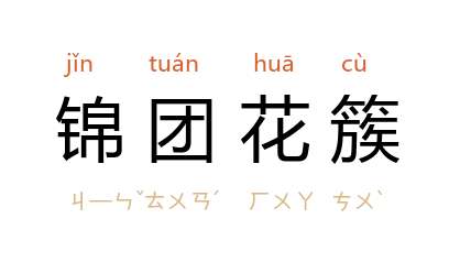 引《红楼梦》第八八回:“那 巧姐 身上穿得锦团花簇。”亦作“锦簇花团”。 《花月痕》第十二回:“两廊间酒香茶沸,水榭上锦簇花团。”